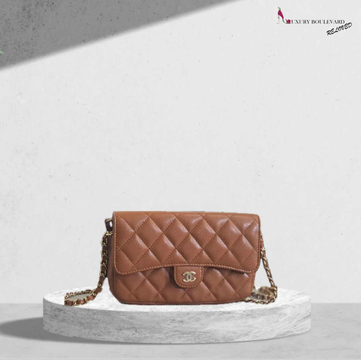 Chanel - (2023) Caramel Brown Caviar Champagne GHW New Style Wallet on chain (WOC)