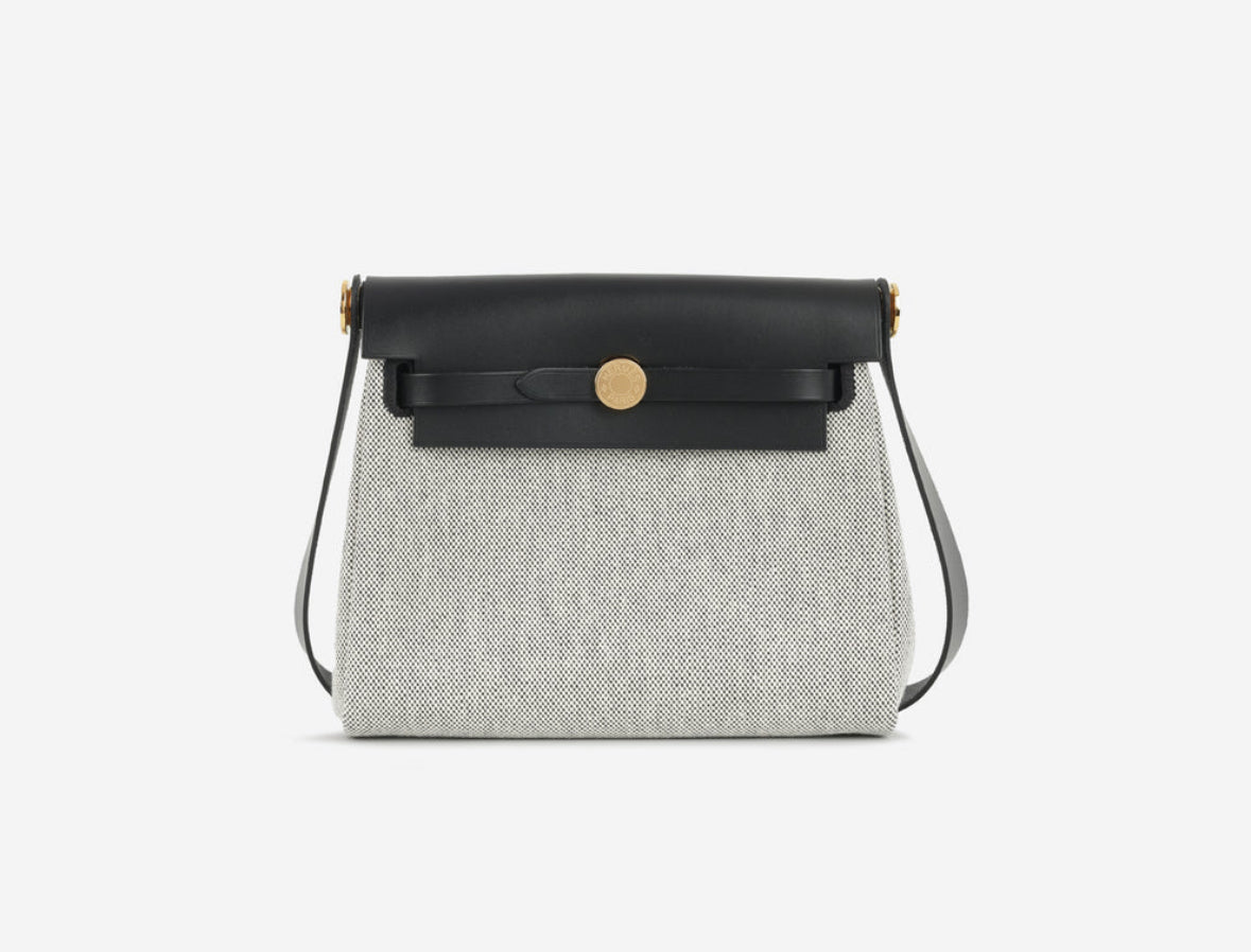 Hermès - Herbag 20 in noir / blanc quadrille toile in noir hunter leather with gold tone hardware W stamp (2024)