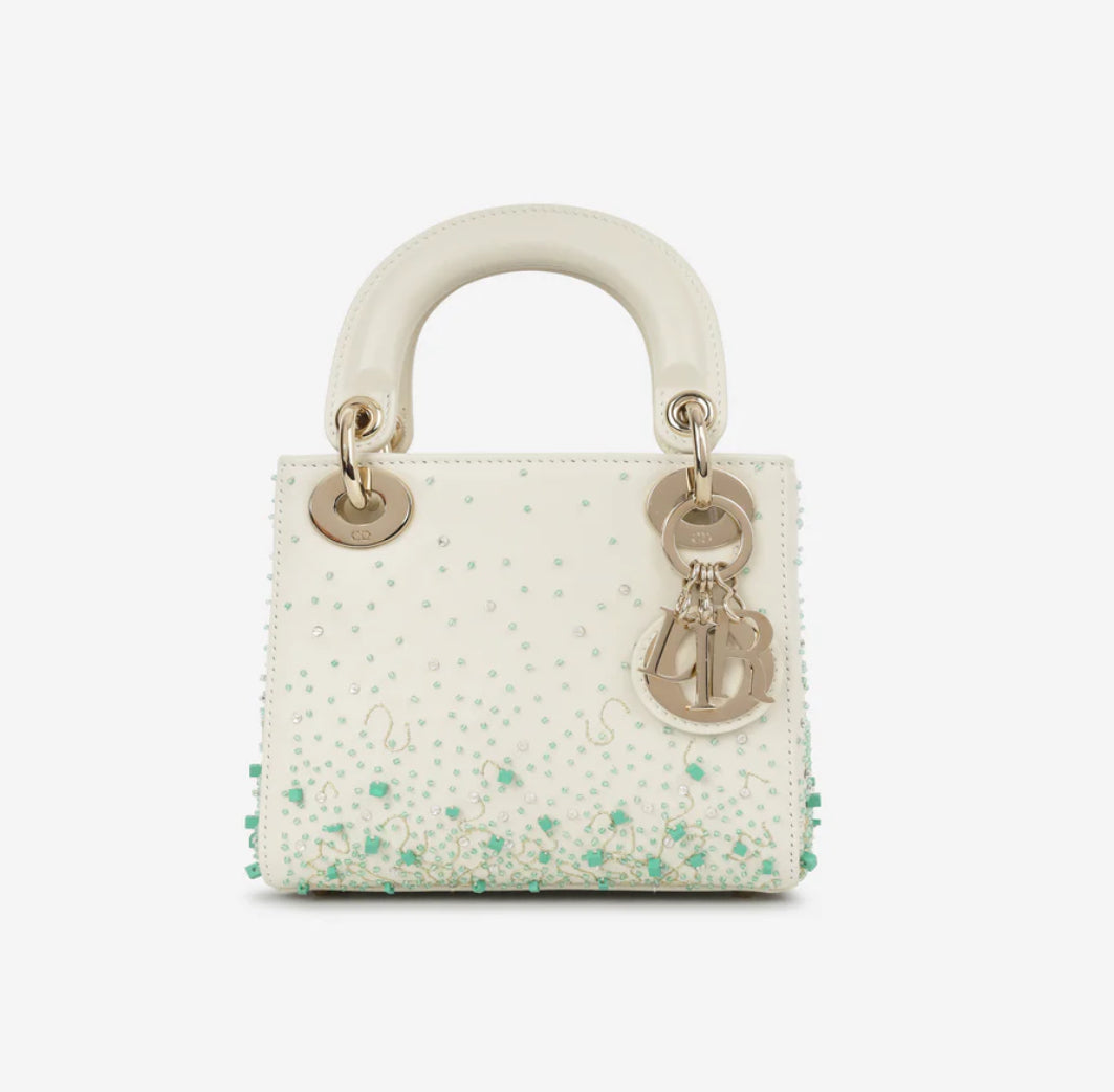 Dior - Mini Lady Dior in ivory lambskin leather with mint green crystal detailing and CGHW (2024)